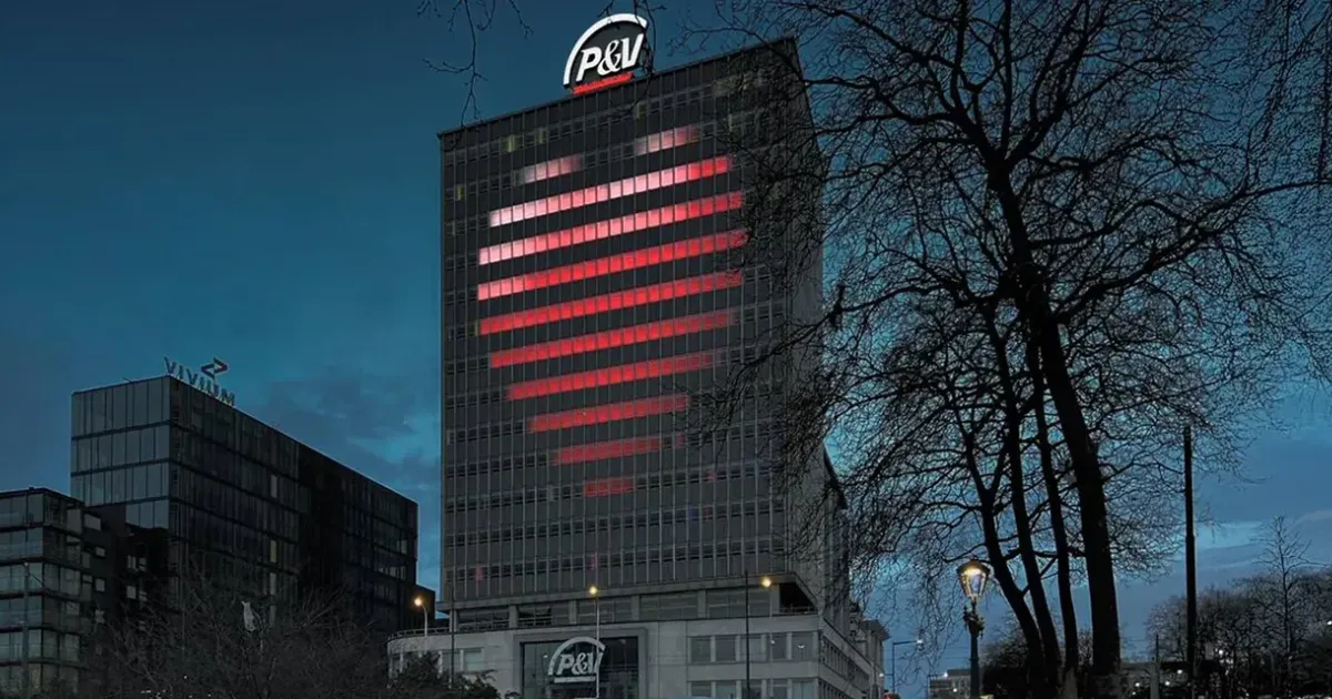 Gevel van het kantoorgebouw P&V Groep met een groot verlicht hart